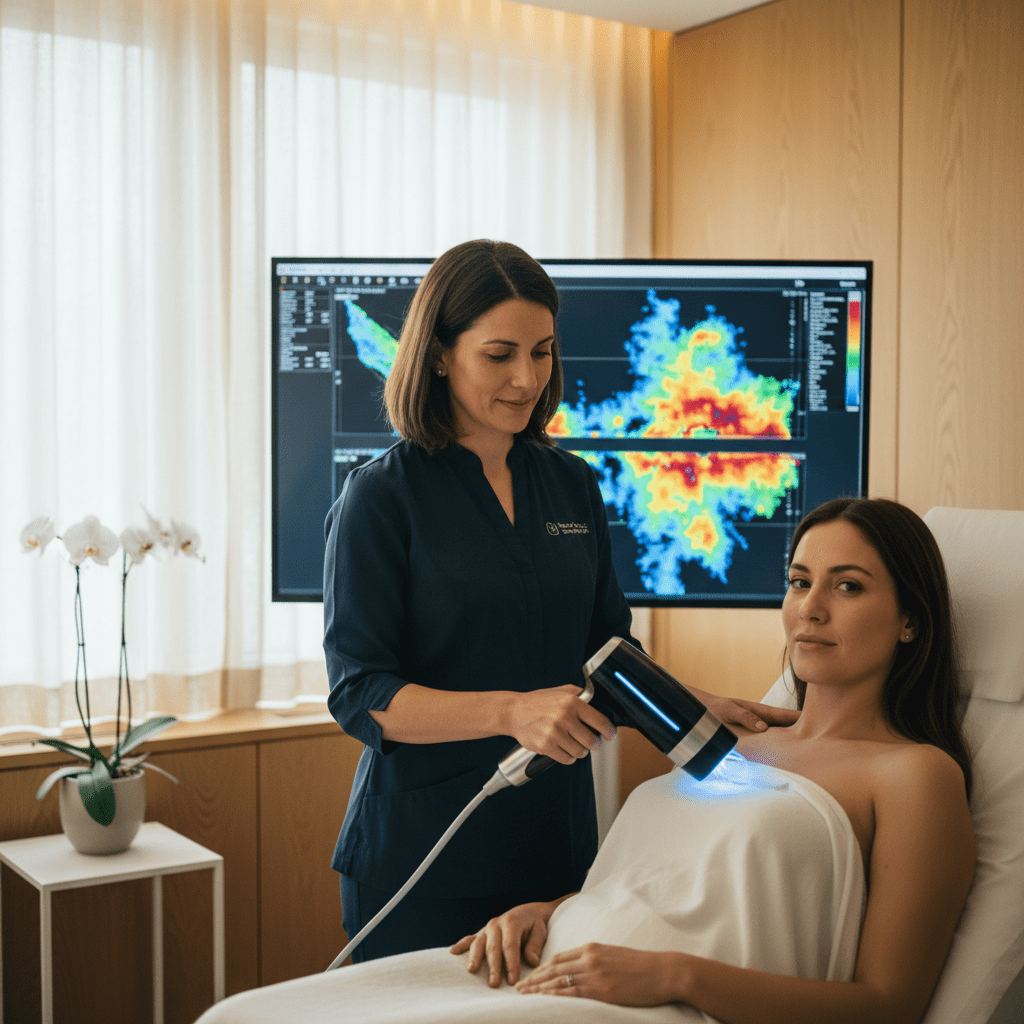 A termografia é um método que detecta alterações de temperatura na superfície da pele e, por consequência, possíveis anomalias nos tecidos subjacentes. Embora não substitua exames tradicionais, a termografia pode ser utilizada como um complemento à mamografia, especialmente para mulheres que desejam evitar radiação. Este método é considerado não invasivo e pode ser uma alternativa interessante, acompanhando outros testes diagnósticos.